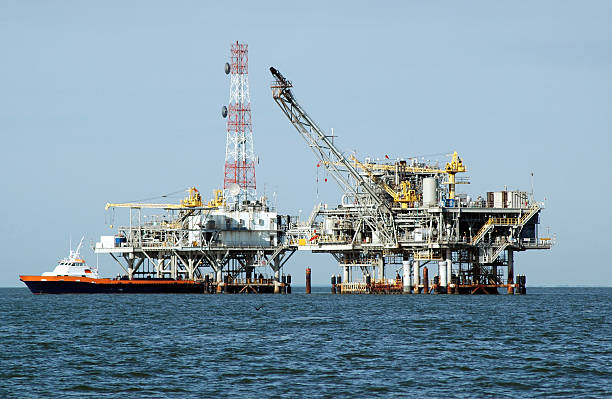 Gas rig with multiple components and crewboat docked. Off the coast of Alabama in the Gulf of Mexico.