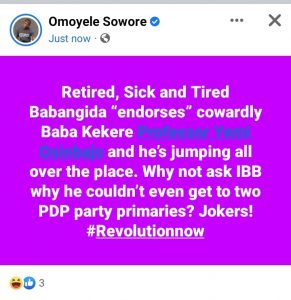 “Retired, Sick and Tired Babangida “endorses” cowardly Baba Kekere Professor Yemi Osinbajo and he’s jumping all over the place. Why not ask IBB why he couldn’t even get to two PDP party primaries? Jokers!” he wrote on his verified Facebook page.