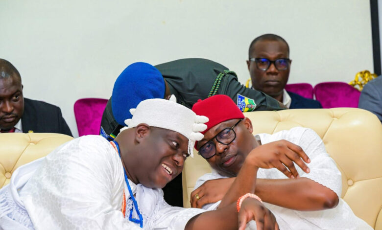 The Ooni of Ife, Oba Adeyeye Enitan Ogunwusi (L) in a chat with Governor Siminalayi Fubara ( R) at the opening session of the meeting of the Southern Nigeria Traditional Rulers Council, held in Port Harcourt on Thursday.