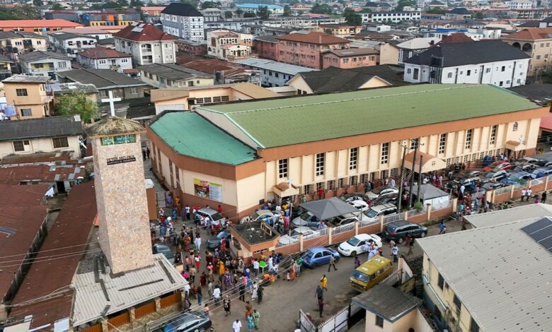 A drone view of Christians departing St. Peter and Paul Catholic Church after a Sunday mass in Palmgrove, Lagos, Nigeria, on Nov. 2, 2025. (Sodiq Adelakun/Reuters)
