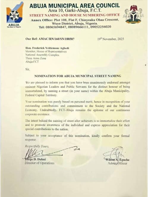 Abuja, Nigeria – The Abuja Municipal Area Council (AMAC) has bestowed a prestigious national honour on Rt. Hon. (Chief) Frederick Yeitiemone Agbedi, Ph.D, member representing Sagbama / Ekeremor Federal Constituency, nominating him for the naming of a street within the Abuja Municipality in recognition of his unparalleled service to Nigeria’s democratic and developmental progress.