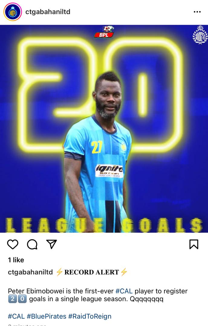 All time Highest Goalscorer of Bayelsa United Football Club of Yenagoa, Peter Ebimobowei is now celebrated in a South Asian country as the First ever Player to score twenty goals in a single season for Bangladesh top flight Club, Abahani Chittagong.