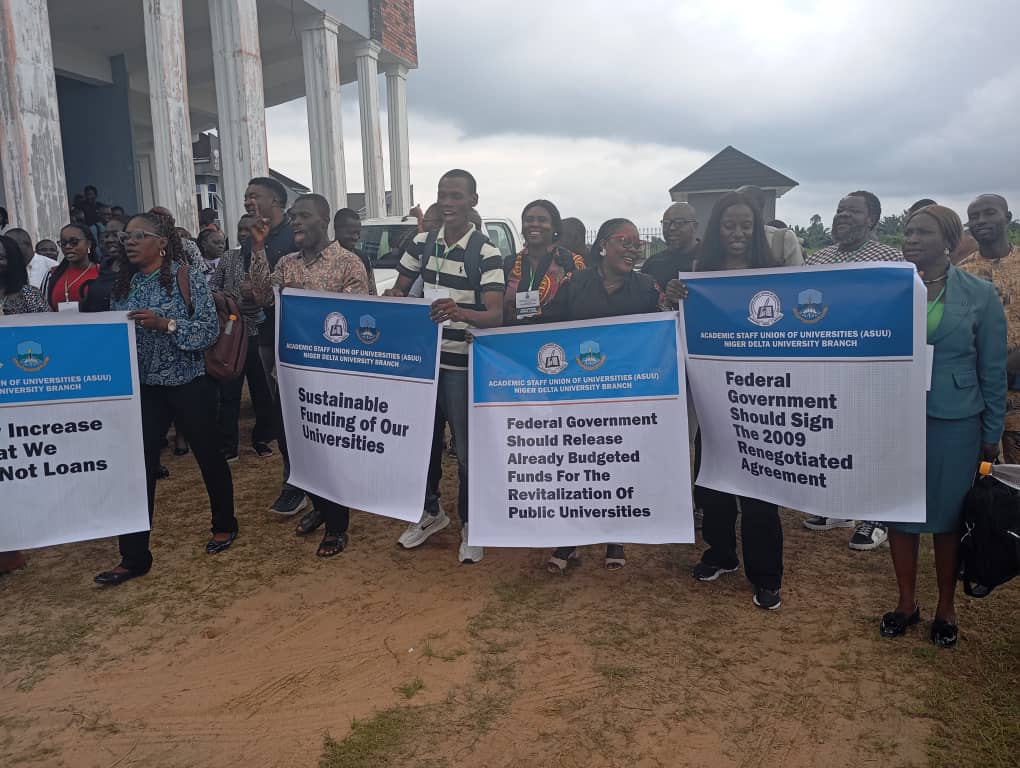 Lecturers in the Bayelsa State owned Niger Delta University, Amassoma have staged a peaceful protest around the university campus against the recently introduced Federal Government Tertiary Institution Staff Support Fund loan scheme.