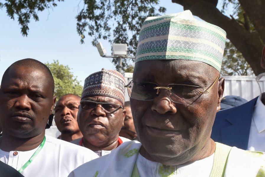 Peoples Democratic Party (PDP) presidential candidate Atiku Abubakar (L) speaks to journalists after casting his ballot at a polling station. (Photo by PIUS UTOMI EKPEI / AFP)