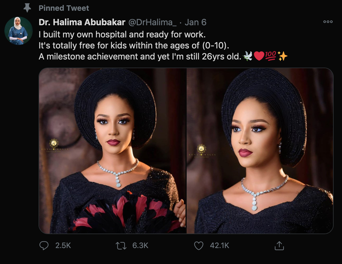 A milestone achievement and yet I’m still 26yrs old.🕊❤💯✨ pic.twitter.com/UEaGcnGk26— Dr. Halima Abubakar (@DrHalima_) January 6, 2021