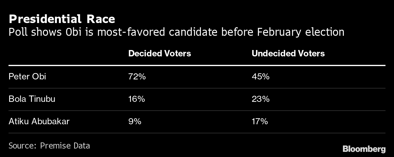 The results of the survey conducted for Bloomberg News by Premise Data Corp. were published on Wednesday as the official campaign to succeed President Muhammadu Buhari kicked off.
