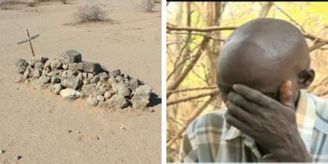 A collage of a stone grave and the husband of the woman who collapsed and died in Baringo County.NTV/ DESERT MOUNTAINEER