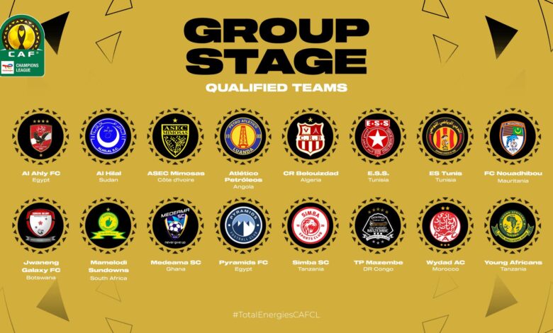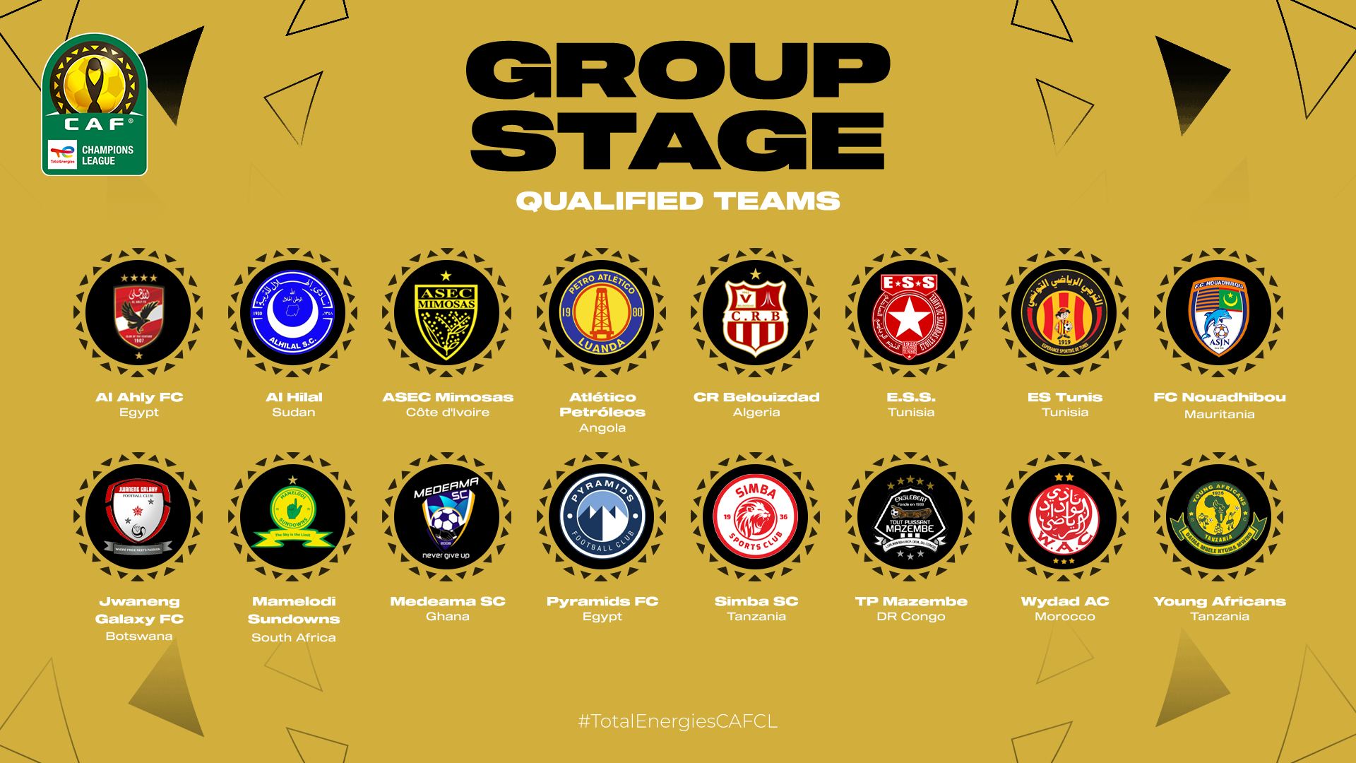 Al Ahly SC (Egypt) Al Hilal (Sudan), Asec Mimosas (Cote d’Ivoire), CR Belouizdad (Algeria), ES Sahel (Tunisia), Esperance (Tunisia), FC Nouadhibou (Mauritania), Jwaneng Galaxy (Botswana), Mamelodi Sundowns (South Africa), Medeama SC (Ghana), Petro de Luanda (Angola), Pyramids (Egypt), Simba SC (Tanzania), TP Mazembe (DR Congo), Wydad AC (Morocco), Young Africans (Tanzania).