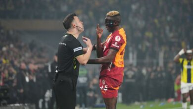 Victor Osimhen reacts to referee Cihan Aydin during the Ziraat Turkish Cup Quarter Final Match between Fenerbahce and Galatasaray at…