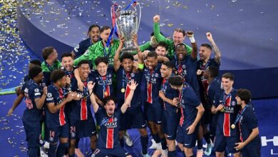 Paris Saint-Germain’s players celebrate with the trophy after the UEFA Champions League final football match Paris Saint-Germain (PSG) and Inter…
