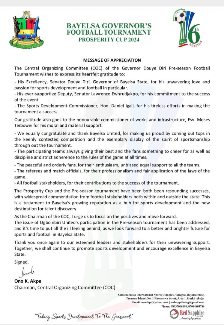Yenagoa, Bayelsa State – The Central Organizing Committee (COC) of the Governor Douye Diri Pre-season Football Tournament has expressed its heartfelt gratitude to all stakeholders who contributed to the resounding success of the event.