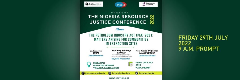 Social Action, in collaboration with the Bayelsa NGO Forum (BANGOF), is organising the Nigeria Resource Justice Conference in Yenagoa, Bayelsa State, today, Friday, July 29, 2022, as part of activities to promote citizens’ and communities’ participation in actions that defend human rights and livelihoods in the sites of petroleum extraction in the Niger Delta basin. The conference will focus on the opportunities and challenges of the Petroleum Industry Act 2021 for addressing communities’ environmental, health and livelihood concerns.