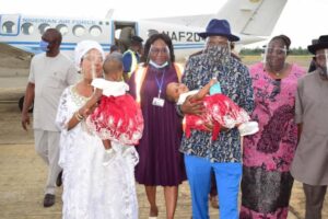 The twins and their parents arrived the Bayelsa International Airport in company of the NAF Chief of Medical Services (CMS), Air Commodore Gideon Bako, onboard a NAF Beechcraft KingAir 350i aircraft.