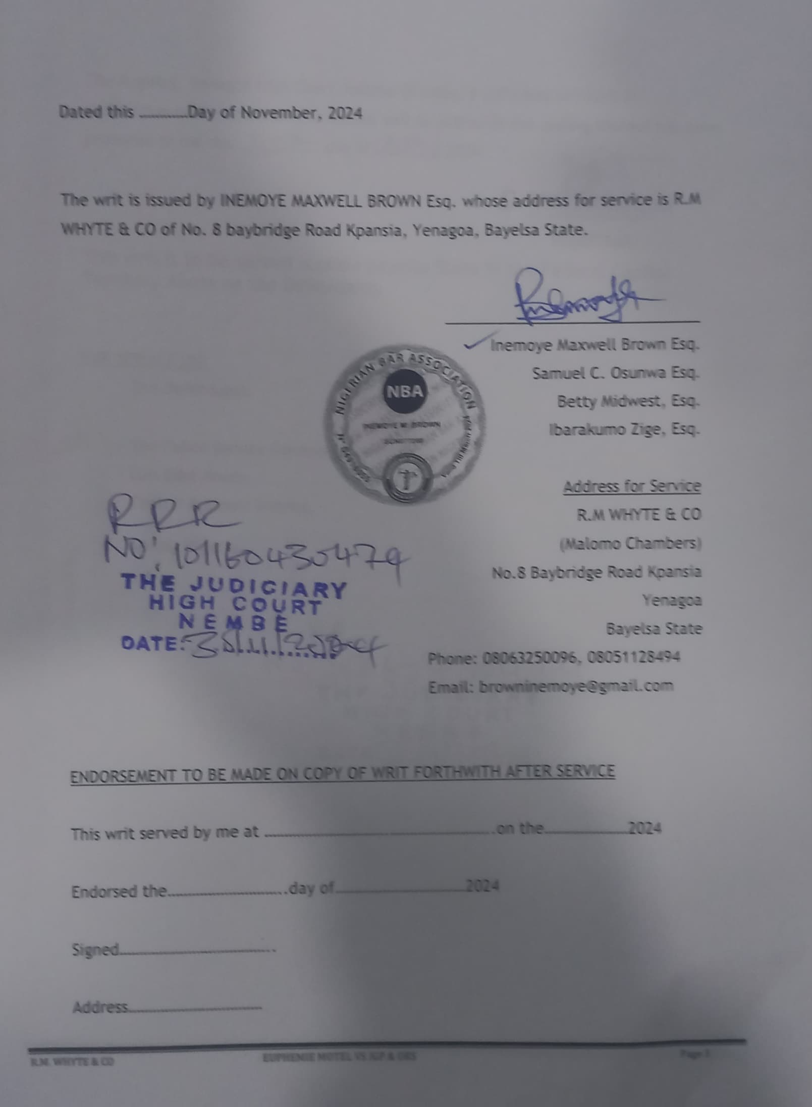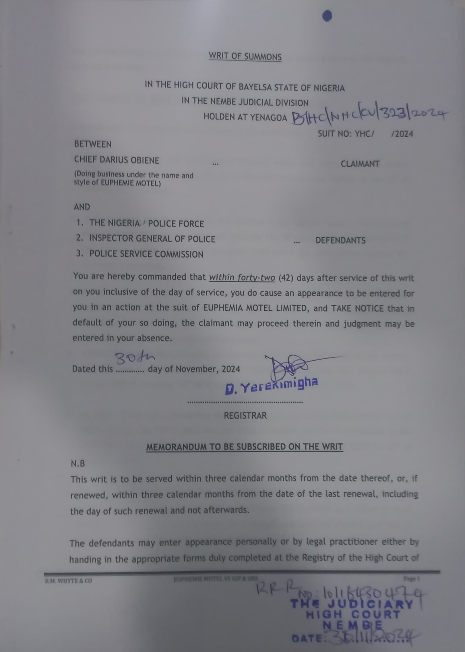 The owner of the popular Euphemie Motel in Opu-Nembe in Nembe Bassambiri community of Nembe Local Government Area of the State, Chief Darius Obiene had filed a suit against th Inspector-General of Police, Kayode Egbetokun, Nigerian Police and the Police Service Commission over the refusal to settle the alleged unpaid debt incurred by the Police SWAT team deployed from 12th of August, 2023 till date.