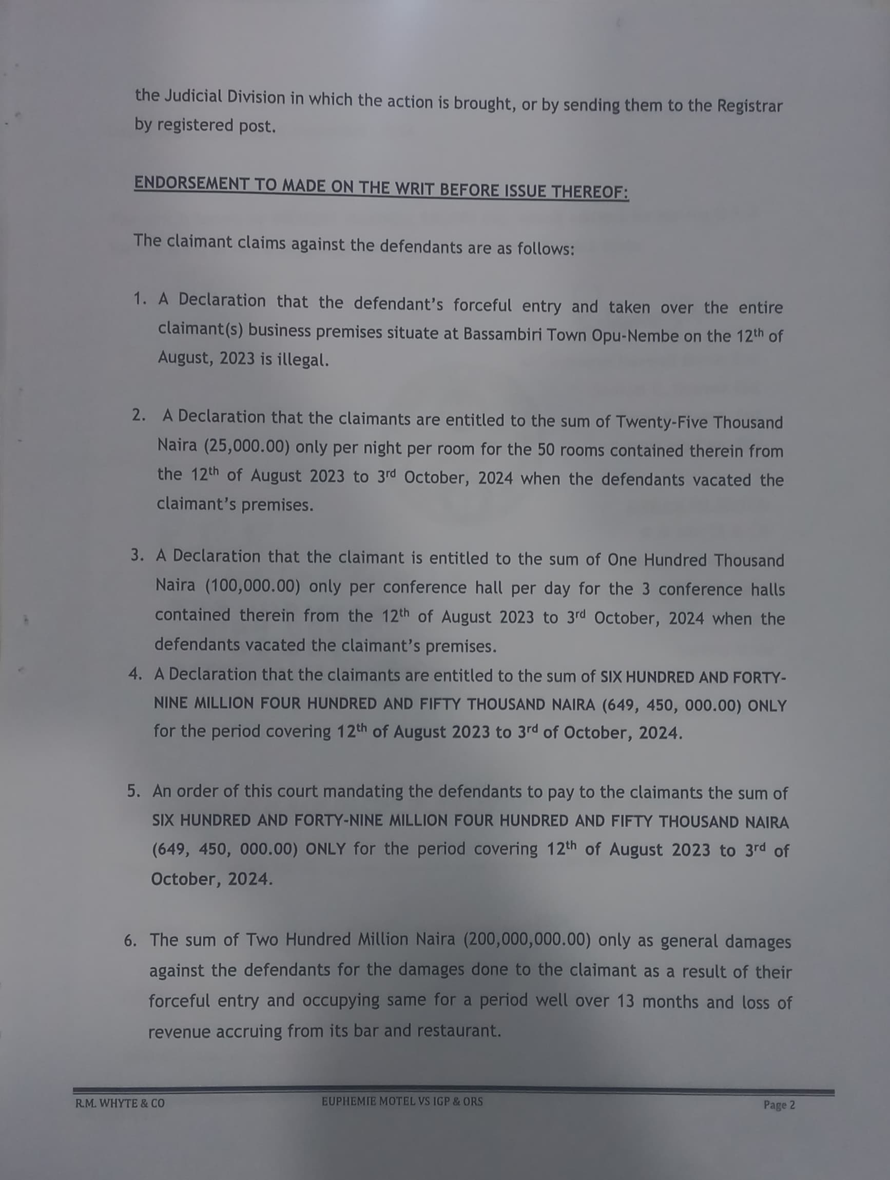 “And the sum of N200,000,000 against the defendant’s for the damages done to the claimants as result of their forceful entry and occupying same for a period well over 13 months and loss of revenue accruing bar and restaurant.