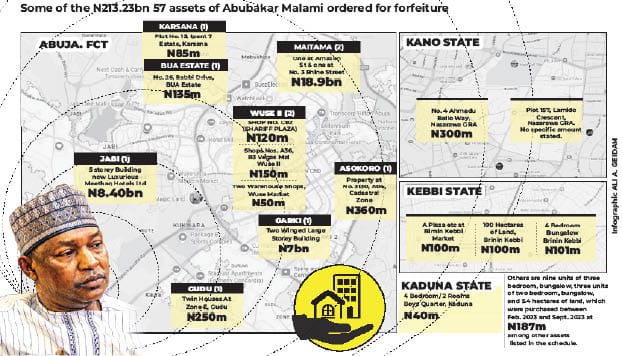 The property, which are 57 in number, were valued at N213,234,120,000 and are located in different parts of the country, including Abuja, Kebbi, Kano and Kaduna States.