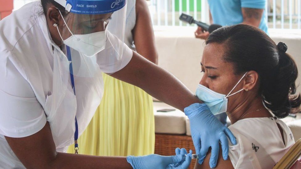 Woman receiving jab in SeychellesIMAGE COPYRIGHTAFP