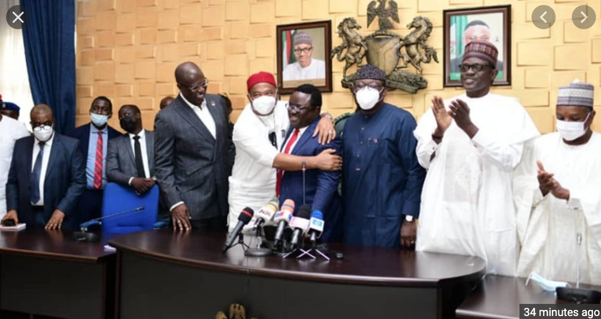 The visiting governors were Mai Mala Buni of Yobe, Atiku Bagudu of Kebbi, Hope Uzodinma of Imo, Simon Lalong of Plateau, Badaru Abubakar of Jigawa and Kayode Fayemi of Ekiti.