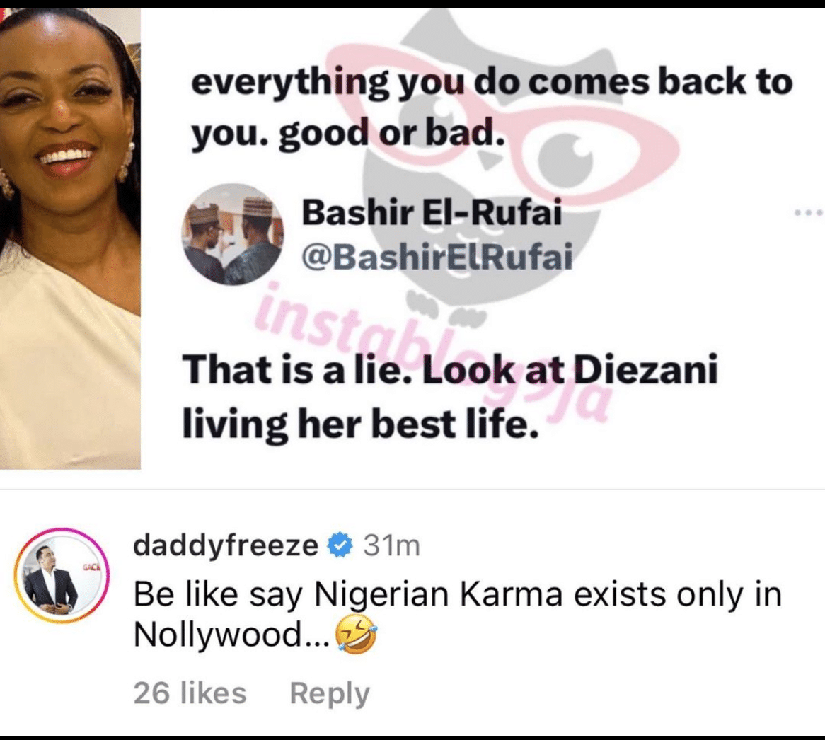 Reacting to the post on an Instagram blog post, Daddy Freeze wrote: “Be like, say Nigerian karma only exists in Nollywood”