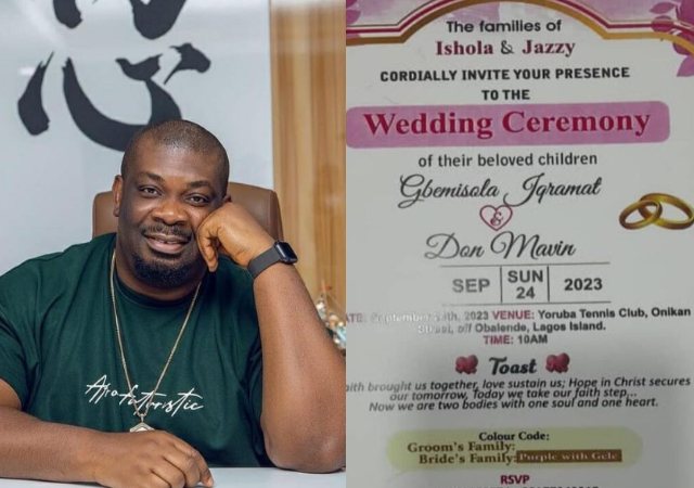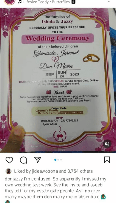 Don said that he missed his own wedding and expressed confusion over the wedding invitation. He said that an invitation for the wedding and aso ebi was left at his estate gate.