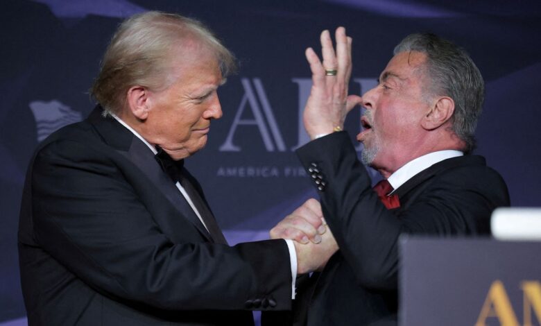 Image:Donald Trump greets actor Sylvester Stallone at a gala at Mar-a-Lago in November. Pic: Reuters