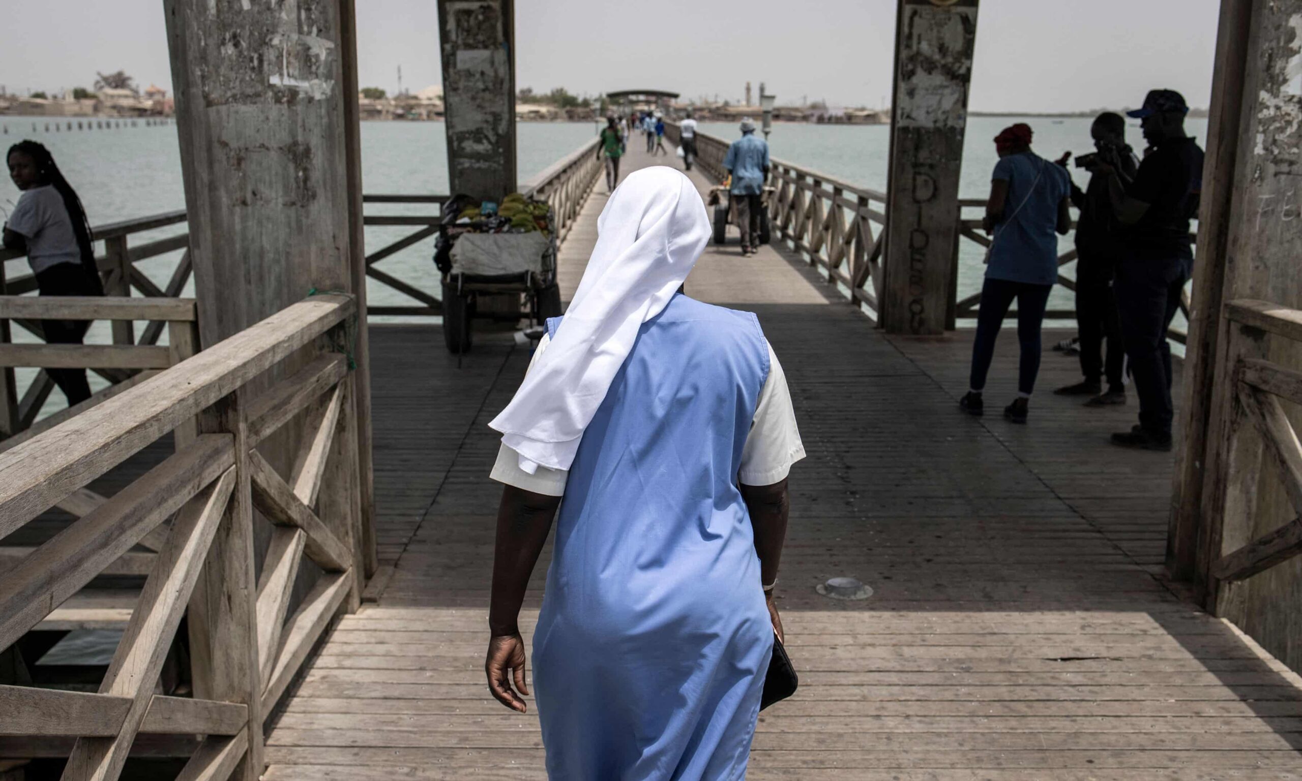 A Catholic nun walks along a bridge towards the island of Fadiouth, Senegal. Photograph: John Wessels/AFP/Getty Images