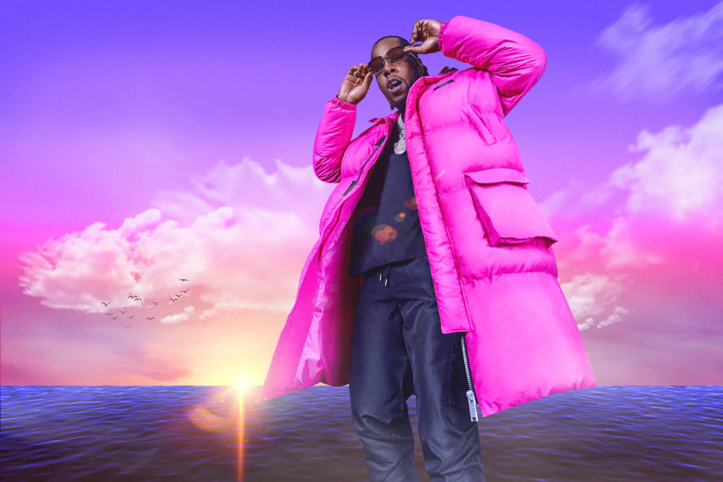 Burna Boy’s pink puffer jacket for boohooMAN collection.