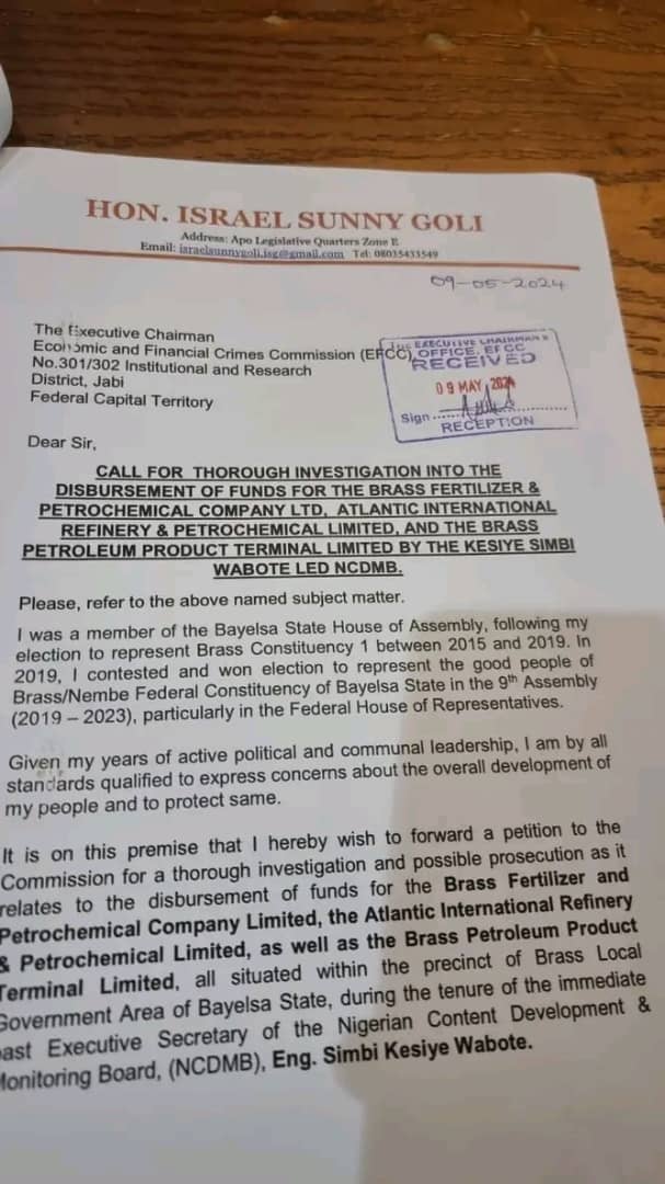A Former member of the Federal House of Representative from Bayelsa State, Hon. Isreal Sunny-Goli has filed a petition before the Economic and Financial Crime Commission (EFCC) over the need for a thorough investigation into the controversy surrounding the disbursement of funds for the Brass Fertilizer and Petrochemical Company Limited, the Atlantic International Refinery & Petrochemical Limited, as well as the Brass Petroleum Product Terminal Limited State by the immediate past management of the Nigerian Content, Development and Monitoring Board (NCDMB) led by Engr. Simbi Wabote.