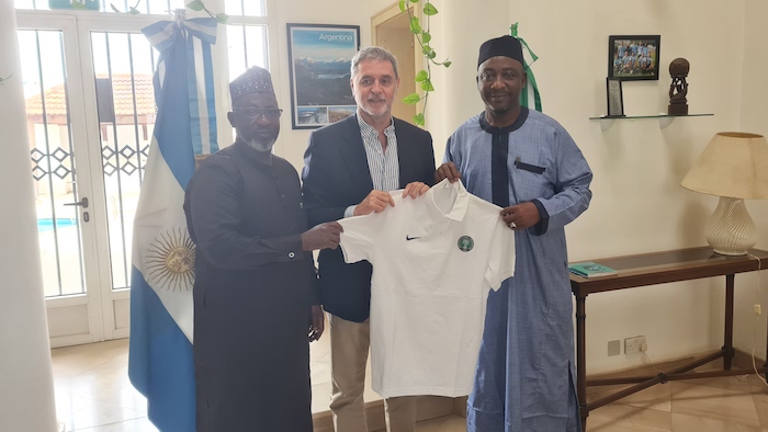Also present at the occasion were the NFF General Secretary, Dr Mohammed Sanusi; Deputy Consul Nicolas Perazzo; NFF’s Director of Communications, Ademola Olajire; NFF’s Chief Protocol Officer, Emmanuel Ayanbunmi; Consular Official, Ms Ifesinachi Udeh and; special assistant to NFF President, Abubakar Barde.