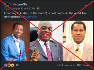 “According to Forbes, of the ten (10) richest pastors in the world, five are Nigerians,” reads the caption on a post by HistoryVille, a Facebook account that highlights historical events, particularly in Nigeria.