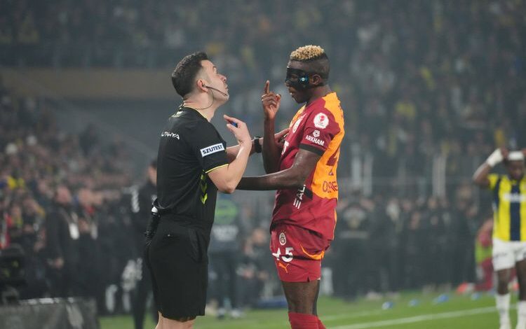 Victor Osimhen reacts to referee Cihan Aydin during the Ziraat Turkish Cup Quarter Final Match between Fenerbahce and Galatasaray at Ulker Stadium in Istanbul , Turkey on April 02, 2025. [Photo Credit/ IMAGO].