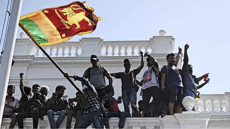 Anti-government protesters demonstrate from a balcony on Sri Lanka Prime Minister Ranil Wickremesinghe’s office building in Colombo on Wednesday after he was named acting president. The protesters defied a state of emergency, tear gas and water cannons to storm the building after the President Gotabaya Rajapaksa fled the country, with the crowd demanding that both men step down in the face of an economic crisis. Picture: AFP