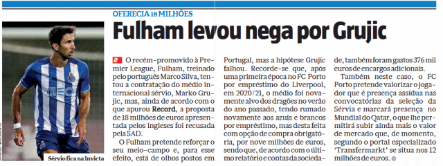 There is a possibility Porto may end up keeping hold of Grujic altogether as they believe the midfielder’s valuation could increase astronomically if he performs for Serbia in the upcoming FIFA World Cup in Qatar.