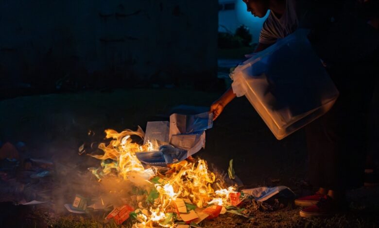 An election official burns ballots after the counting has finished at a voting station in Libreville on November 16, 2024. Gabon on Saturday held a referendum on a new constitution after a coup ended 55 years of rule by the Bongo dynasty in the oil-rich nation.