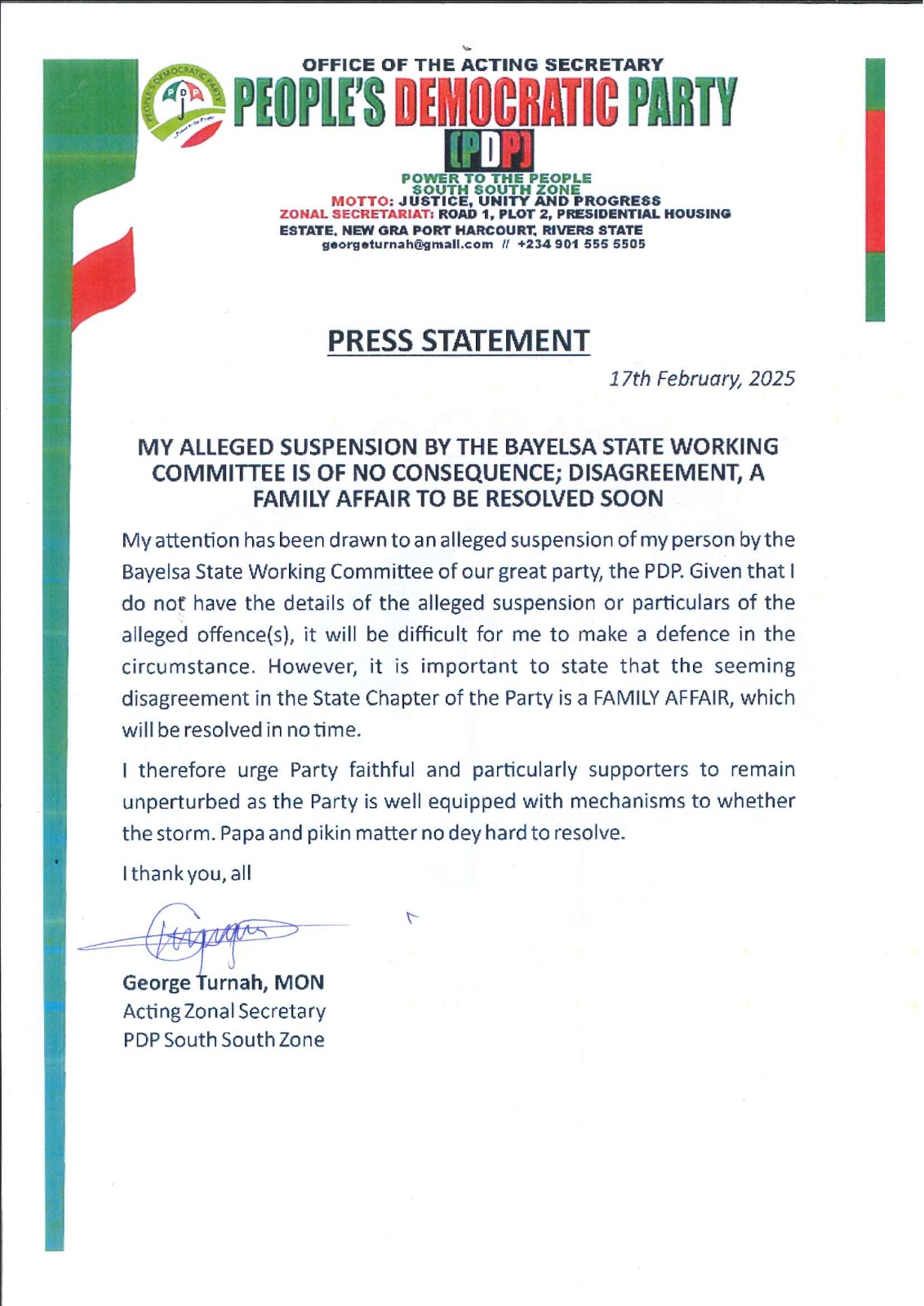 In a statement released by George Turnah on Monday titled “My Alleged Suspension By The Bayelsa State Working Committee Is Of No Consequences, Disagreement, A Family Affair To Be Resolved Soon” he admitted that he is not aware of his offences.