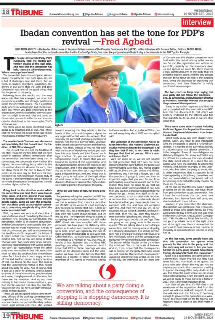 Rt. Hon. Fred Agbedi, PhD, is the leader of the House of Representatives caucus of the Peoples Democratic Party (PDP). In this interview with General Editor, Politics, TAIWO ADISA, he declares that the national convention held in Ibadan Oyo State, has reset the party and would help it play a decisive role in the 2027 polls. Excerpts: