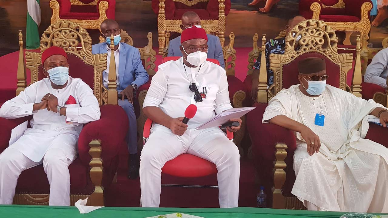 Imo State Governor, Hope Uzodimma, flanked by the Minister of Science and Technology, Dr. Ogbonnaya Onu (left) and former Senate President, Ken Nnamani, at the South East All progressives Congress (APC) stakeholders’ meeting in Owerri…yesterday