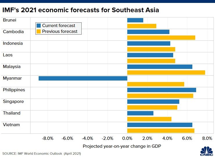 The IMF expects the five largest developing economies in Southeast Asia to collectively grow by 4.9% in 2021, down from its previous projection of 5.2%. Those five economies are Indonesia, Malaysia, the Philippines, Thailand and Vietnam.