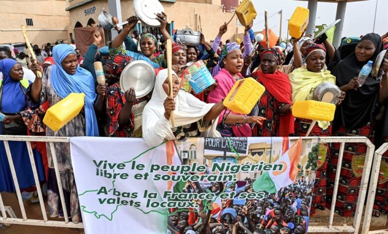 Supporters of Nigers National Council of Safeguard of the Homeland (CNSP) protest outside the Niger and French airbase in Niamey on 30 August 2023 to demand the departure of the French army from Niger. (Photo by – / AFP)