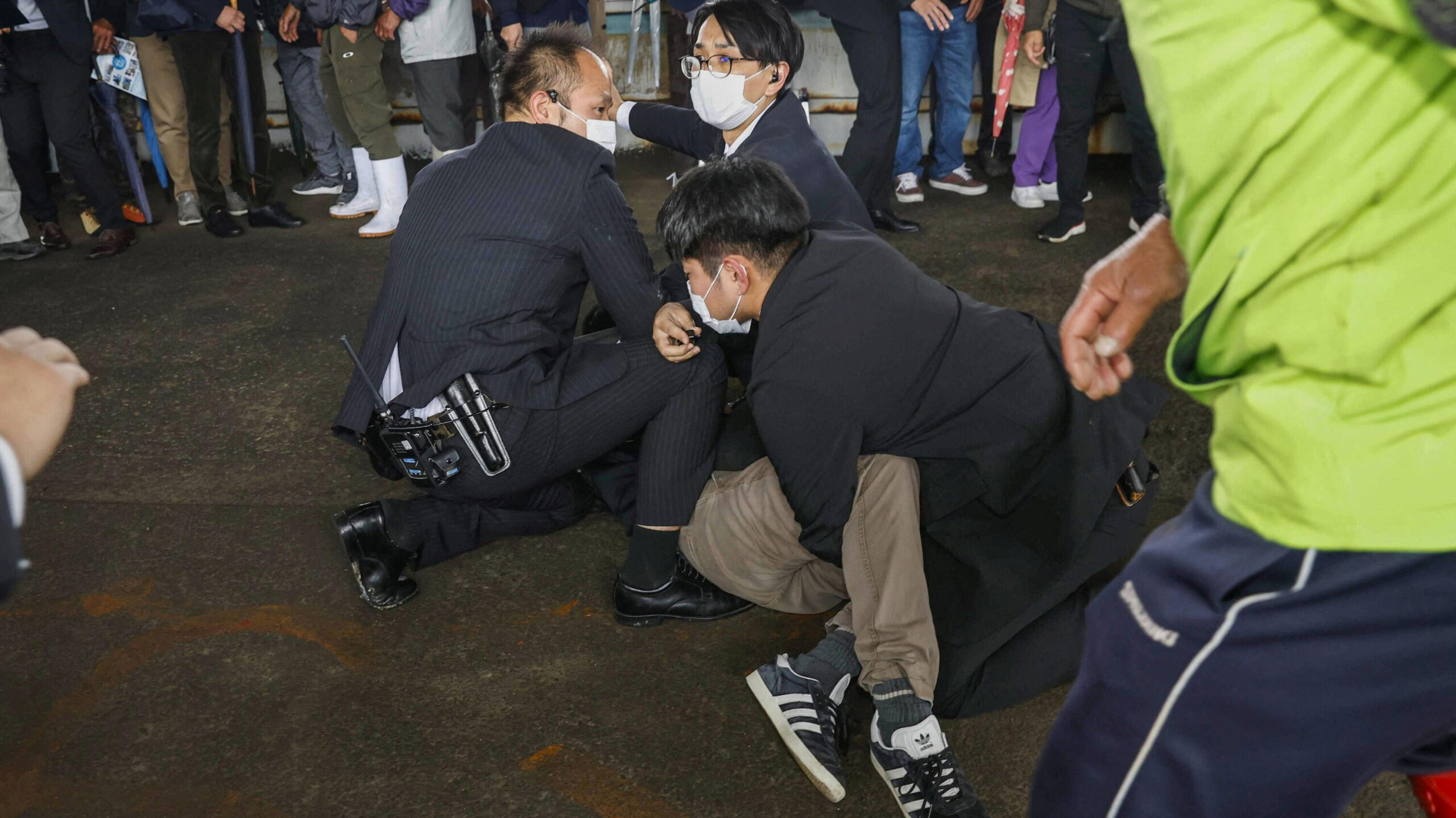 Video footage posted by the national broadcaster, NHK, on Saturday showed police officers, a security detail and what appeared to be members of the public tackling the man the police say is the suspect. The man, who was carrying a gray and black backpack and wearing beige pants, black Adidas sneakers and a blue jacket, appeared to struggle as the police and security officers half-dragged, half-carried him from the scene.