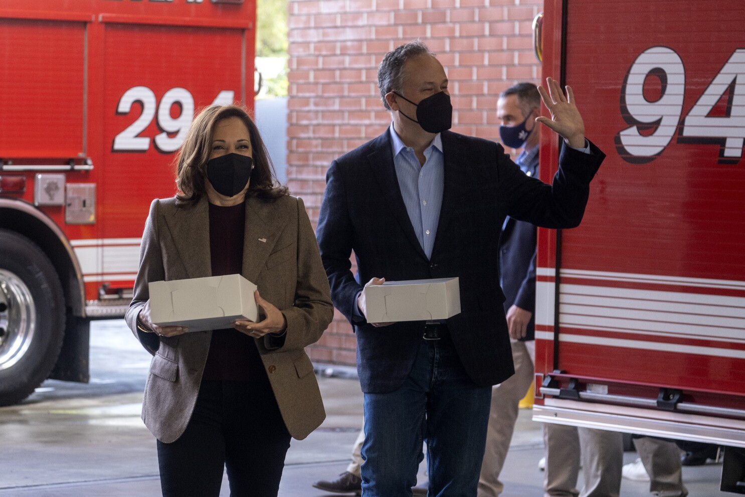 Harris and her husband, Doug Emhoff, on Friday delivered doughnuts and holiday greetings to the firefighters at Los Angeles Fire Department Station 94.