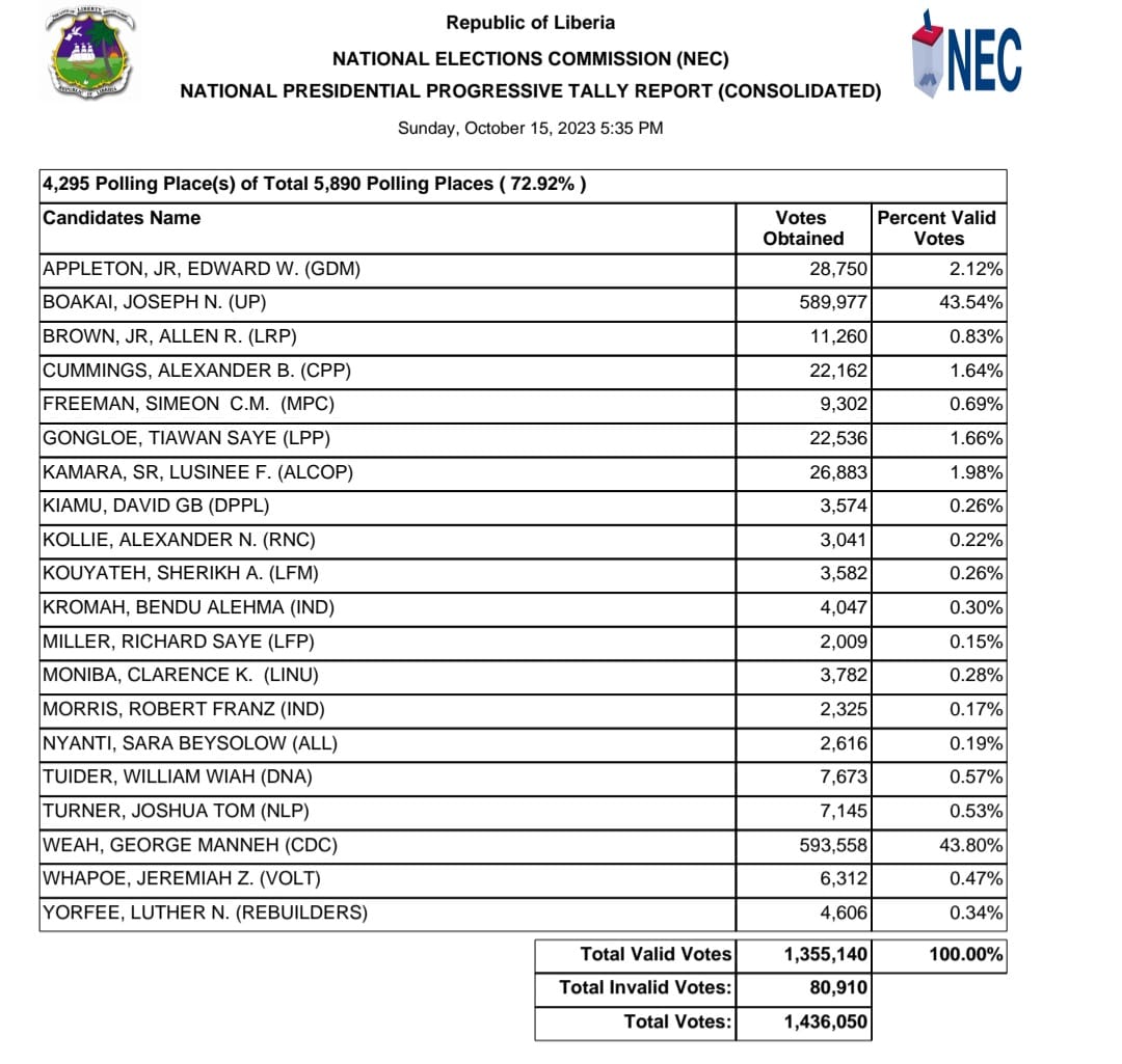 Results available on the website of Liberia’s election management body, NEC, show that almost 50 per cent (49.8 ) of the results have been announced.
