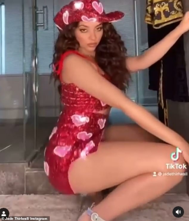 Sizzling display: Jade Thirlwall couldn’t resist playing dress up as she slipped into a red sparkly minidress and matching cowboy hat to twerk for the camera in a TikTok video