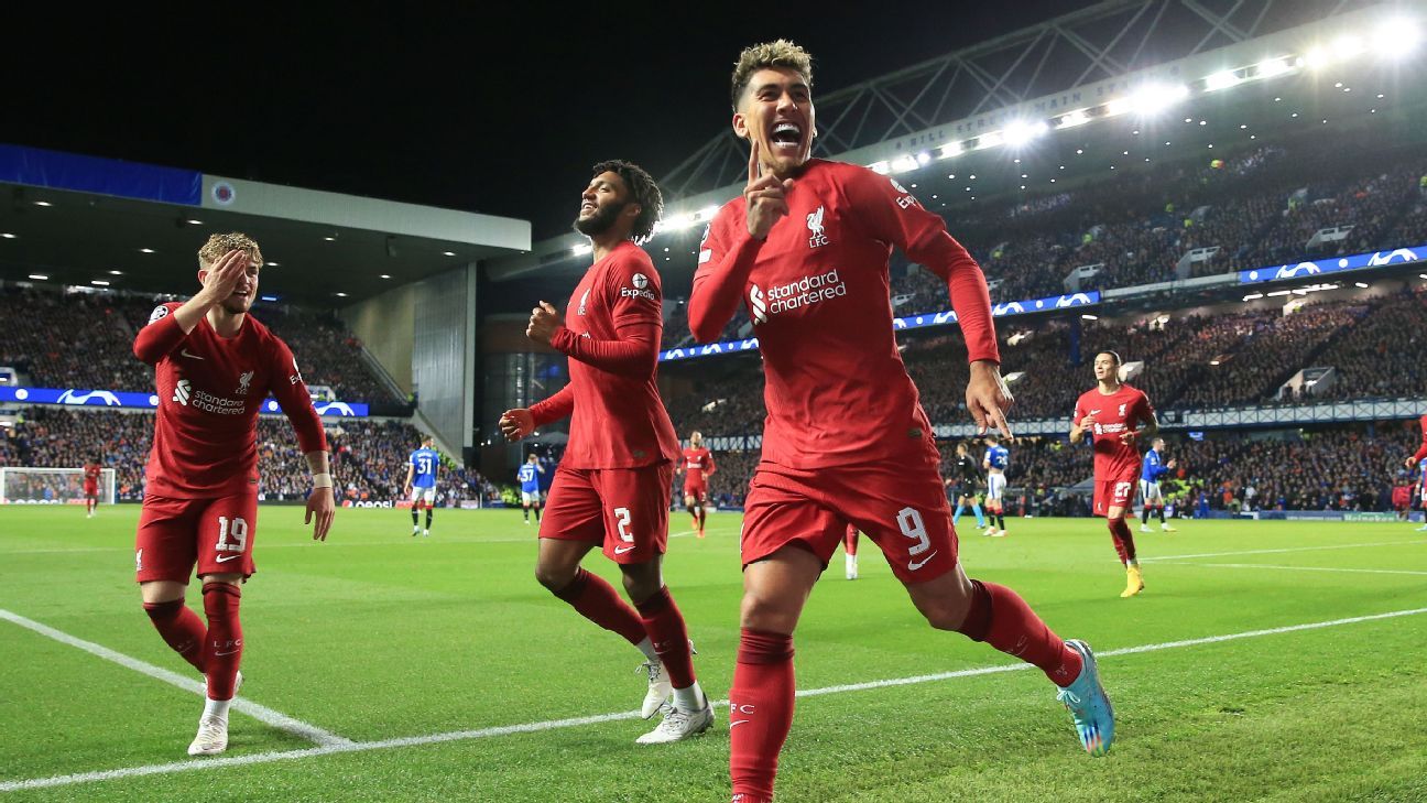 Roberto Firmino celebrates scoring for Liverpool against Rangers in the Champions League