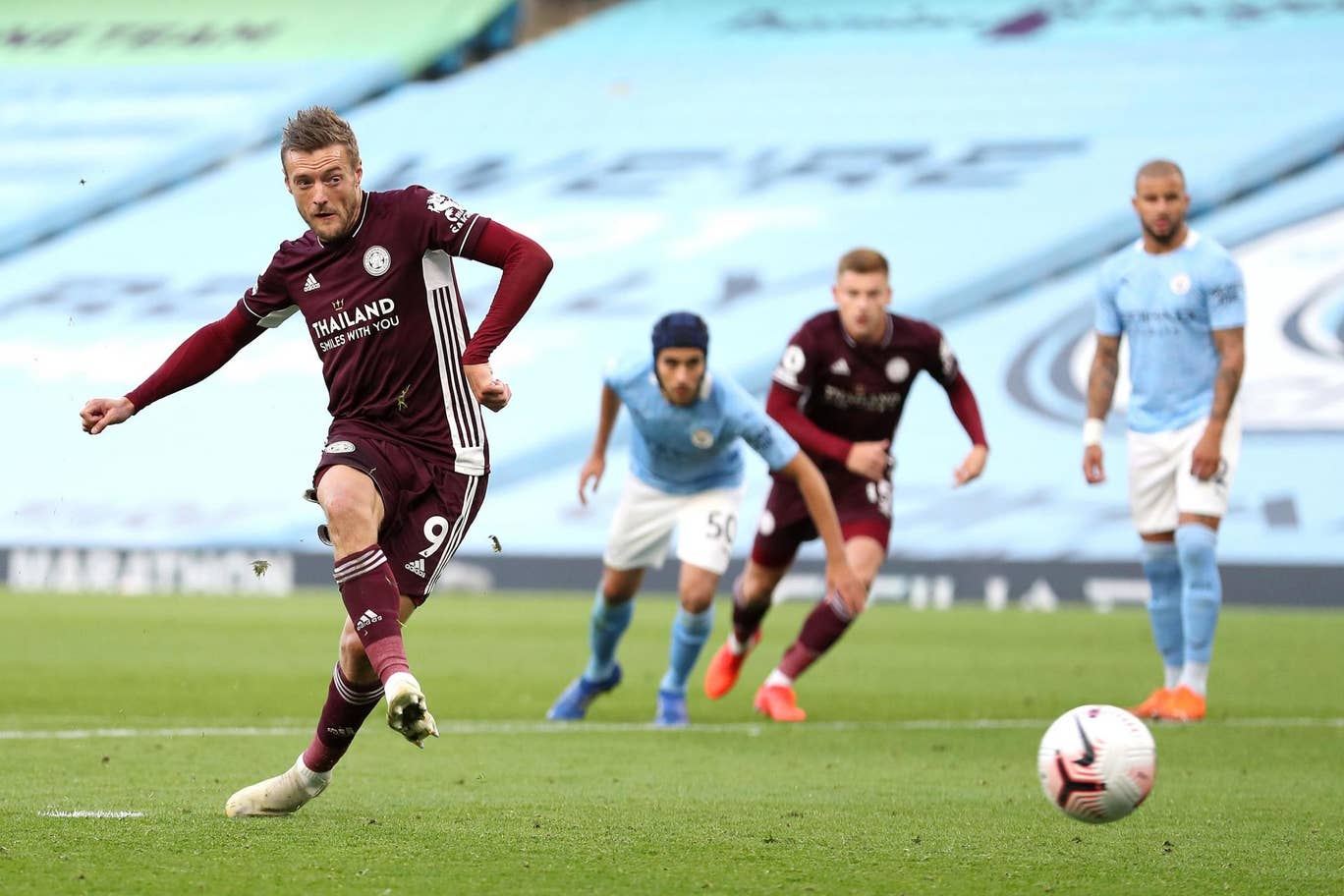 And the 33-year-od wasn’t finished there. He nipped in ahead of Eric Garcia who clumsily brought the Leicester man down for another spot kick, which Vardy calmly passed into the bottom corner.