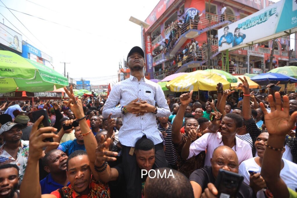 The former governor, who held his presidential campaign in the state on Saturday, was greeted by a large cheering crowd at the entrance of the markets, shortly after meeting with traders in Computer village.