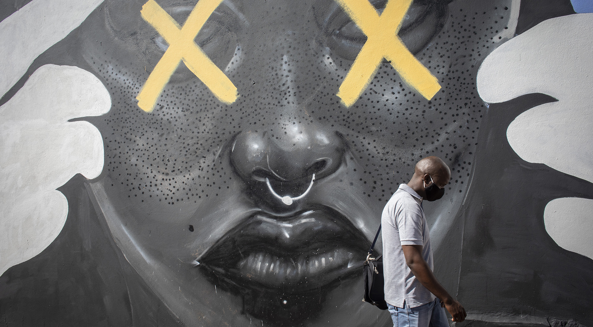 A masked man walks past artwork in central Johannesburg, 26 March 2021. (Photo: EPA-EFE / Kim Ludbrook)