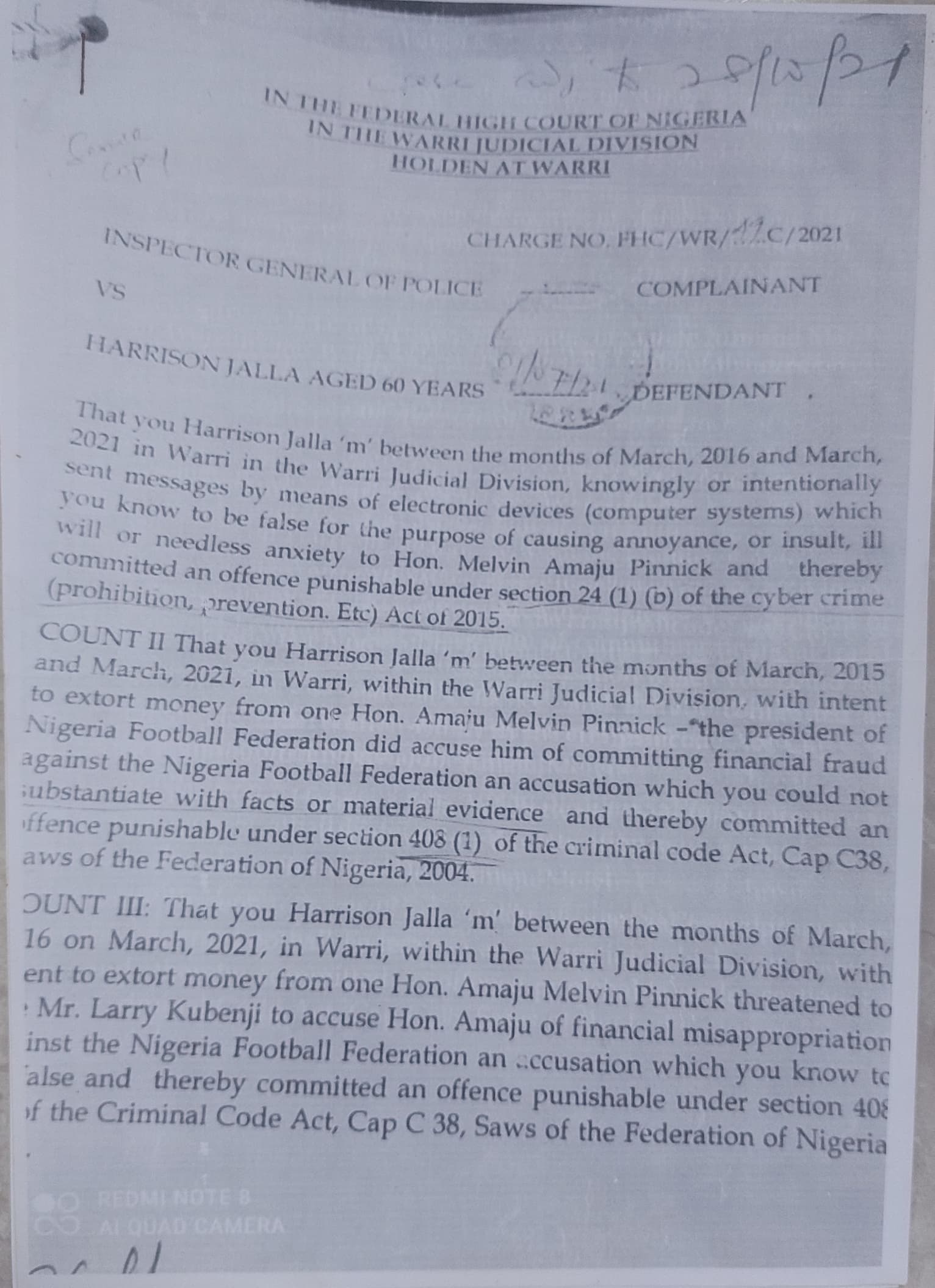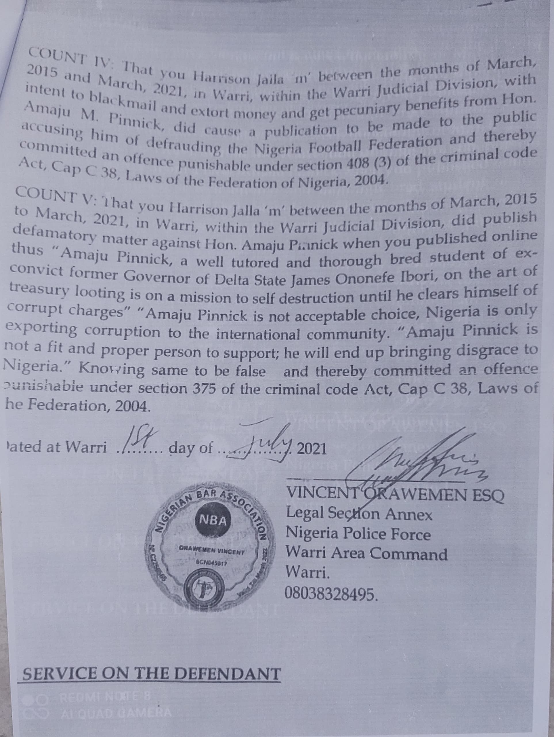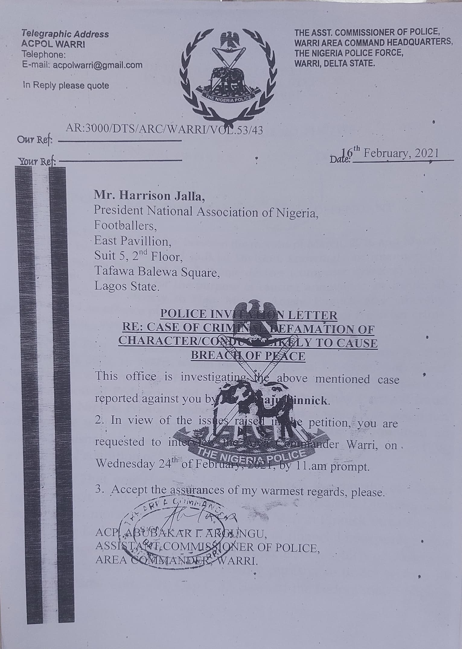 I refrain to publish the letter for its “classified”contents and what transpired at the meeting. And again on february 16th 2021 I received another letter of invitation from the Warri Area Command headquarters in respect of a petition against me by one of the suspects after which framed charges were filed against me at the federal high court in Warri with very stringent Bail conditions I ended up spending 7days at Sapele prison before I could perfect my Bail conditions the matter is still Subsisting at the federal high court Warri.