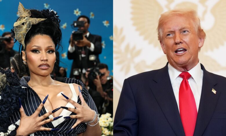 Side by Side images of Nicki minaj at the 2025 Met Gala and Trump on a podium in October 2025.