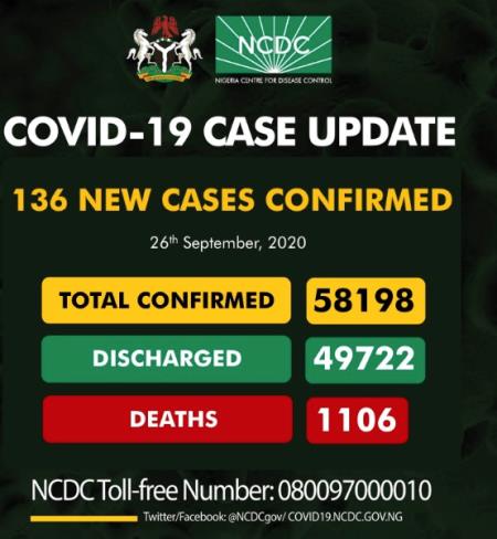 The Nigeria Centre for Disease Control (NCDC) revealed on its official Twitter that 136 new cases of the infections with three deaths have been recorded in the country as of Saturday.